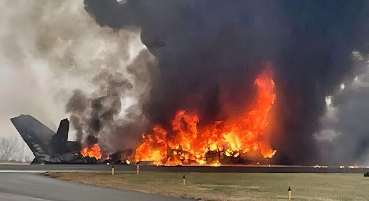 Aerial view of an airport crash site with large flames and thick black smoke.